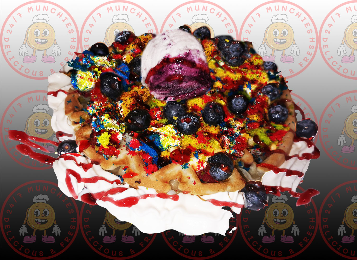 Covered in Rainbow Cake chunks then topped with fresh Blueberries and drizzled with a choice of Berry Sauce.  (Served as Waffle, Crepe or Pancakes)